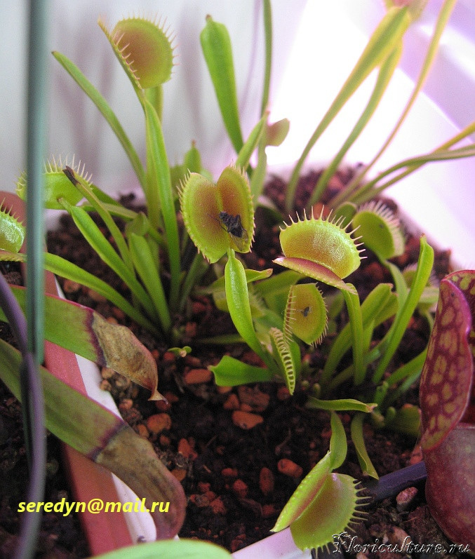 Мне тоже в позапрошлом году привезли меристемную мухоловку из Сочи, она была плачевном состоянии, дело было где-то в октябре, растение в скором времени было отправлено зимовать. Прошлой весной я его рассадил и получил 3 мухоловки. 1я умерла уже к лету, 2я пережила зимовку и сейчас выглядит несколько плачевно и жалко, но вроде потихоньку растет. 3я эта растёт, как на дрожжах, ловушки одна больше другой и появляются со скоростью примерно 1-2 ловушки неделю. Вот только никак краснеть не хочет, хоть и стоит под МГ.