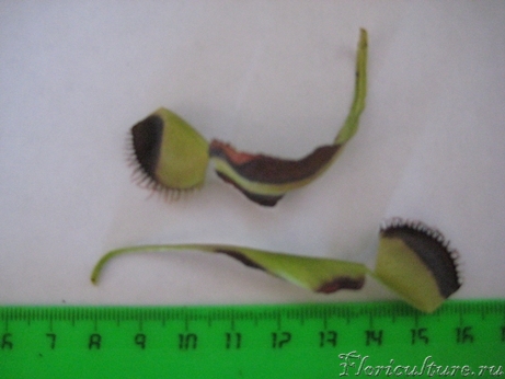 Другое растение в норме. Но у него одна ловушка стала чернеть. Раньше она жука съела, но трупик я не извлек (на фото он в белесый такой порошок превратился) и вот с этого края лист стал чернеть. Что с ним делать? Обрезать или оставить как есть?
