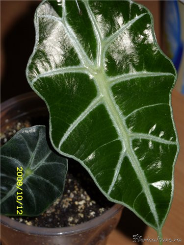- Алоказия клобучковая - правда, сней тоже небольшая проблема - нехватки места - листья не очень уж и большие, но распускает она их на высоте 50-60 см - получается такая высокая "сопля" - извините за выражение - и часто не выдерживают черенки листьев их веса.