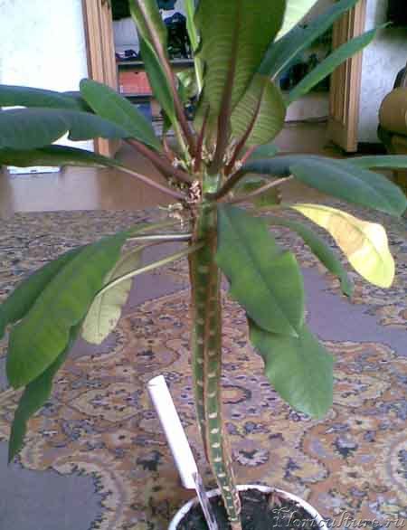 Помогите опознать цветочек. Принесла с работы. Там дерево высотой 1,2 метра. На работе зовем просто"Палка". Долго не было корней. Посадила. На палке появились листочки! Если сломать веточку, то выделяется белый сок. Я думаю что-то среднее между молочаем и суккулентом.