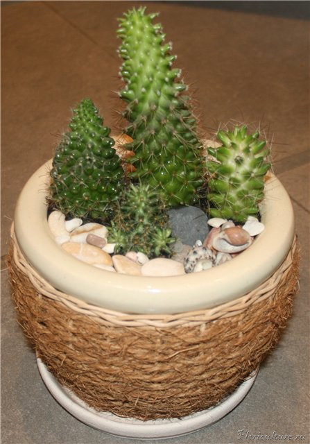 Эх, не очень у меня получился "садик", т.к. идея была другая, хотела только кактусы и выложить вокруг них всё красиво-песочком белым, да камушками и пр. Но из отпуска привезла каких-то суккулентных (как мне кажется) и пришлось натыкать их в плошку. А пока думала, чем бы всё это приукрасить, всё заросло и еще разрастается.