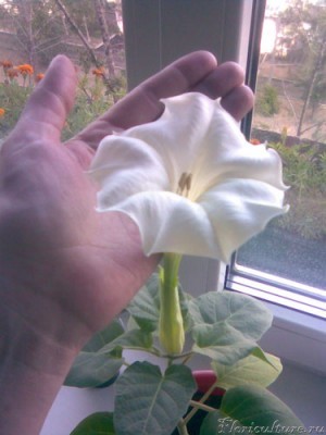 Очень люблю дурман.6 лет воздерживалась его выращивать, сынишка еще маленький был. Сейчас уже все мамины цветочки знает. Разбирается что трогать ненужно. В этом году посадила наконец опять дурманчик. Лето у нас короткое поэтому зимой будет стоять на подоконнике - корневую систему наращивать.А летом поедет на дачу. Сильно цвести ему не даю, да вот не удержалась....По комнате сразу запах лилий разливается..