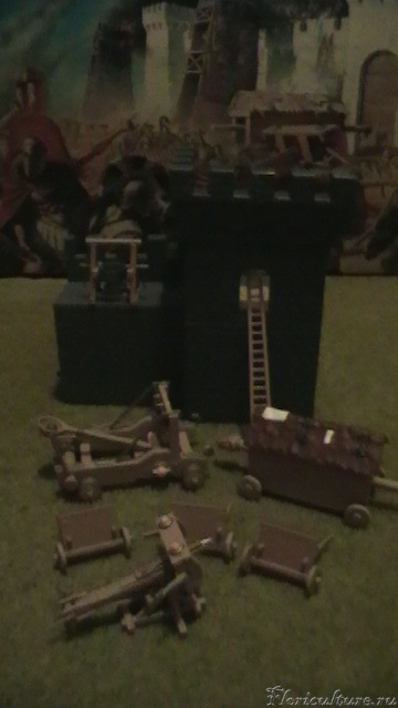 4Метательные и осадные машины-таран,баллиста,катапульта,часть крепости,лесница,котёл со смолой.