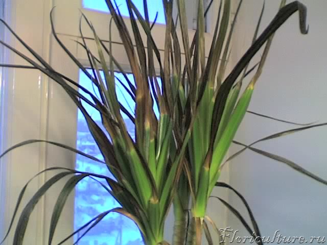согласна с Мелта, драцену подморозили, обрежьте отмершие части листьев и не залейте грунт, дайте просохнуть верхней части почвы в горшке перед поливом.