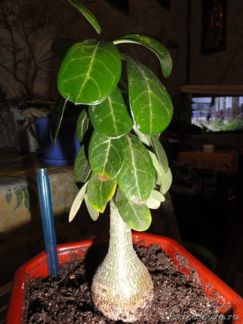 Моим адешкам уже 4 месяца. Но их внешний вид мне как-то не очень нравится. Один вообще стоит лысый. Листья которые отвалились, а которые на кончиках пожелтели. Недавно пересадила их в другой грунт для кактусов, может пойдут на поправку.