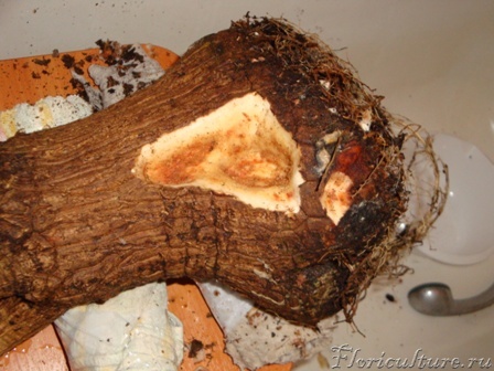 Доставать пришлось разрезая горшок. С приятным удивлением обнаружил что корневая хоть и не много но здоровая, белая. Это хороший признак (фото 10,11)