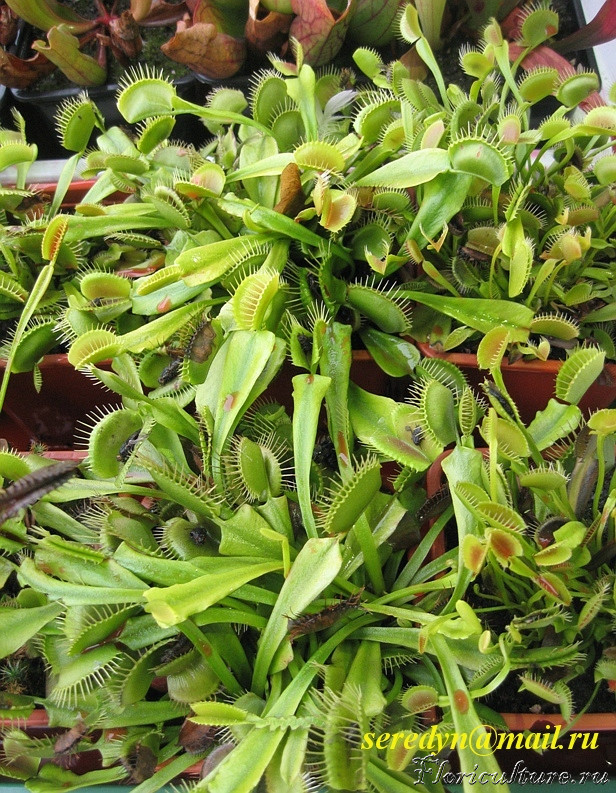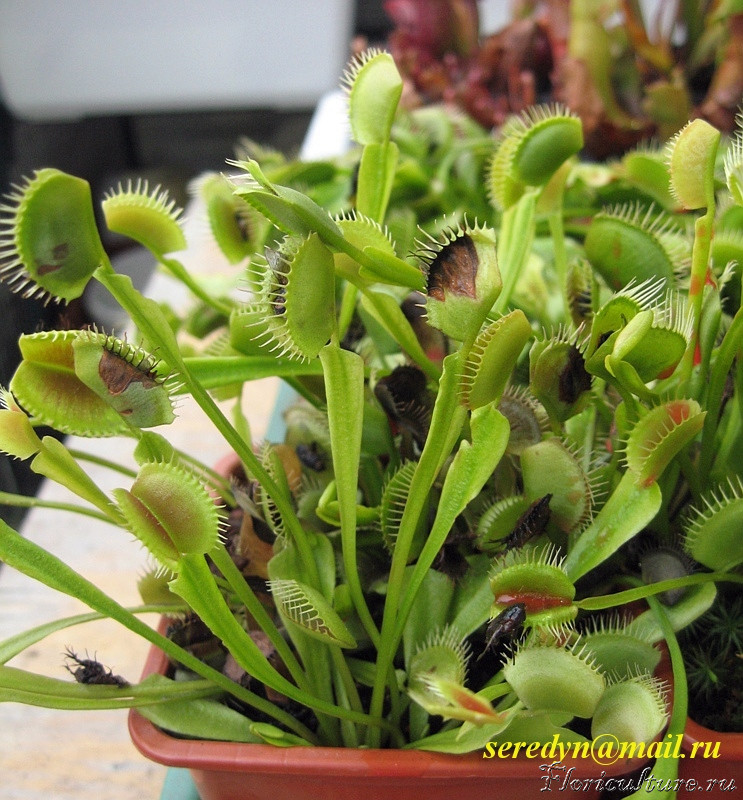 Особенно хочу заметить, что отрастание широких зимних листьев и почернение летних происходит у Мухоловок непрерывно в течении всех зимних месяцев, но только в том случае, если вы растение держите на свету (не боле 8-9 часов света) и температуре не ниже +5 и не выше +10 -15*С. В этом случае Мухоловка растёт, как и в естественных условиях, но очень медленно. И такой способ зимовки наиболее правильный.