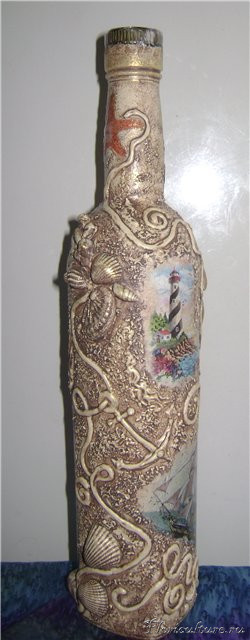 Вот недавно сделала на подарок бутылку с коньячком в морском стиле