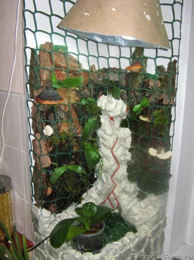 Хочу показать свой орхидный мини уголок. Пока он заполнен только наполовину, но весной я планирую заказать в Тюмени разных мини орхидей. А пока здесь только несколько мини фаленопсисов. На фото плохо видно, но там еще маленький водопадик, красной линией отмечено, как течет вода. Вообще-то планировалось, что вода будет падать с более высокой точки (красный крестик), но оказалось, что я купила слабоватый насос,на заданную высоту воду не поднимает, пришлось переделывать.