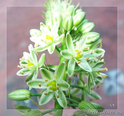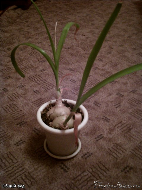 У луковиц периодически подсыхает и отслаивается верхний слой, под которым находятся скопления маленьких дочерних луковиц, которыми он размножается вегетативно - почки отпадают, попадают на почву и быстро укореняются. Генеративно он размножается с помощью цветоноса, который выпускает приблизительно раза два в год, но семян я у него не наблюдал - цветонос срезался сразу после того, как начинал отцветать. А вот пример его цветения из интернета: