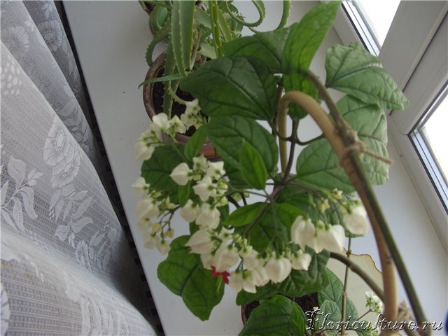 это клеродендрум томпсона, однозначно. Очень неприхотливое растение, любит полив и хорошее освещение. Кстати, я обычно его после того, как отцветет, обрезаю, оставляя небольшой стволик сантиметров на пять, от него потом начинают лезть новые побеги, которые потом снова выкидывают грозди соцветий. А вообще, клеродендрум вьющееся растение, поэтому некоторые его не обрезают, оставляя виться, но у меня после цветения он обычно сбрасывает листья, поэтому я не оставляю голый ствол.