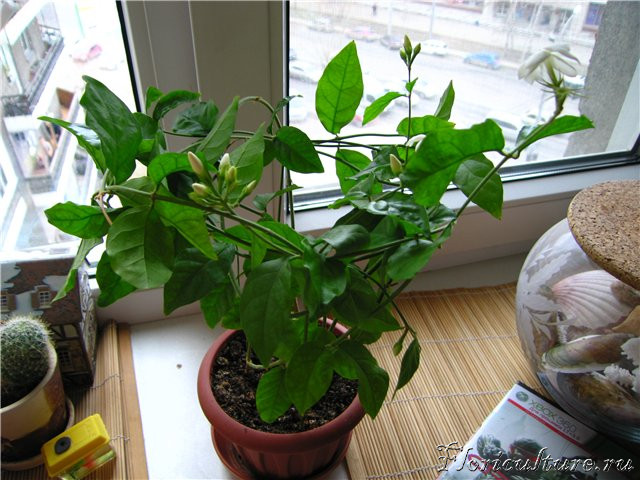 Первое цветение было в конце марта (30 бутонов), следующее - через месяц уже 60 бутонов, потом - около 100. Цветение длится 2-3 недели, потом сразу же - ещё 2-3 недели идёт закладка и развитие бутонов. Т.е. каждый месяц 2 недели цветёт, одновременно раскрывается 5-10 цветов, нежный аромат так и витает в воздухе. И так - по сентябрь месяц включительно. Активно наращивал зелёную массу до середины июля. Формируется сам кустом, живёт в 16см горшке. Летом выносила на улицу под скользящую тень винограда.