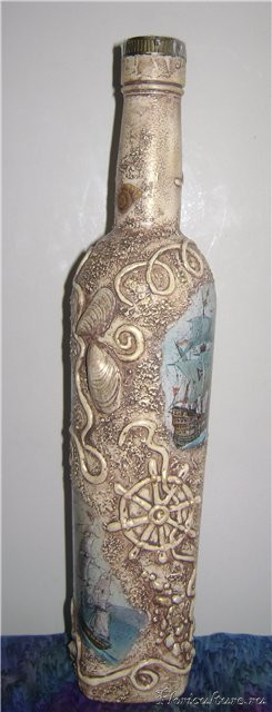 Вот недавно сделала на подарок бутылку с коньячком в морском стиле