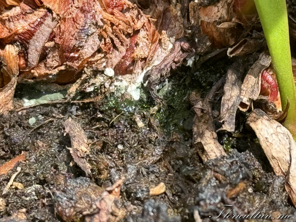 На корневище моей сарацении появился голубовато зелёный налет, с белыми вкраплениями. Листья которые росли рядом с этим местом засохли. Буду признателен, если кто нибудь сможет подсказать что это, и чем это лечить?