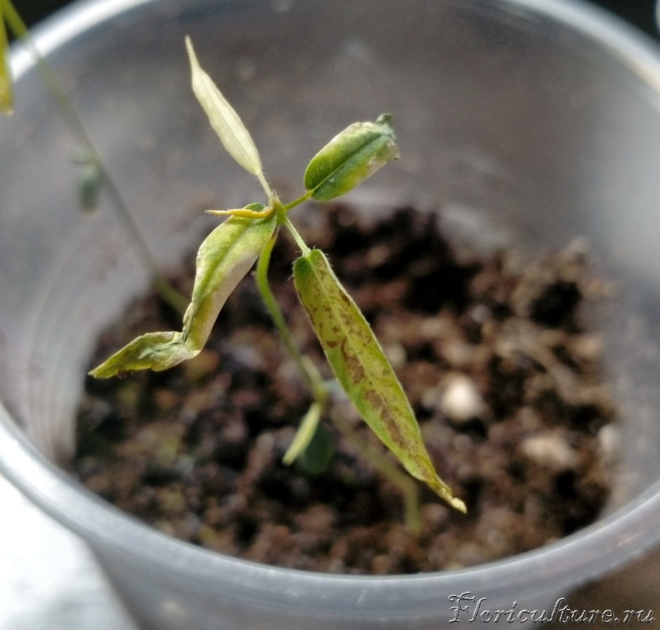 Помогите! Выращиваю десмодиум из семян. Все было хорошо, но потом начали появляться коричневые пятна на листьях, листья начали засыхать. И вообще листья какие-то беловатые и. Новые белые, хотя уже и ближе к лампе ставила, другим растениям света хватает. Помогите, что можно сделать?
