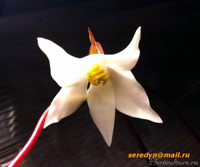 Трудно его сфотографировать чётче, так как он слишком близко к лампе. Вообще удивительна любовь Гелиамфоры к свету. Цветонос тянулся к МГ лампе в 70 Вт и остановился примерно в 5 см от защитного стекла. Здесь стал раскрываться первый цветок. Продолжение цветоноса мне пришлось уже утягивать проволокой иначе есть опасение что он поджариться от тепла. Так вот освещённость в 10 см. от защитного стекла - 130 тыс. люкс! Соответственно в 5 см ещё выше. Я просто боюсь спалить датчик люксметра.