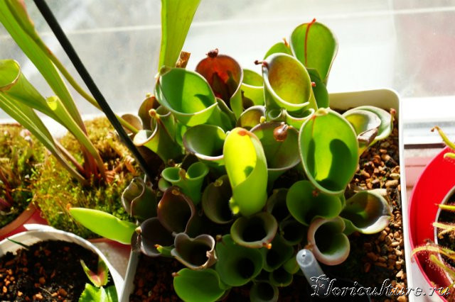 Моё общение с гелиамфорами убедило, что любят они утреннее солнце, в этот момент обильное орошение и обязательные суточные перепады. Кувшины деформируются от нехватки света. Может меня и поправят, сославшись на хорошие лампы, но действительно солнце никакие лампы не заменят для полноценного роста. Мои весной начинают преображаться, как буд-то стряхивая зимнюю спячку. Вообщем солнце + вода + прохлада.