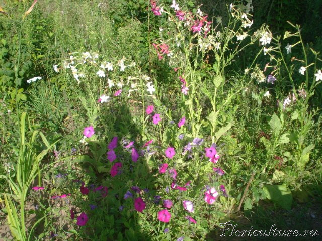 36. Цветущие табаки крылатые, в нижнем правом углу видны цветки табака сандера.