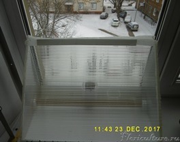 Сеянец мухоловки зимует на окне. Без подсветки. Света очень мало. Солнца третий месяц нет. Отгорожен от комнаты такой конструкцией из поликарбоната.