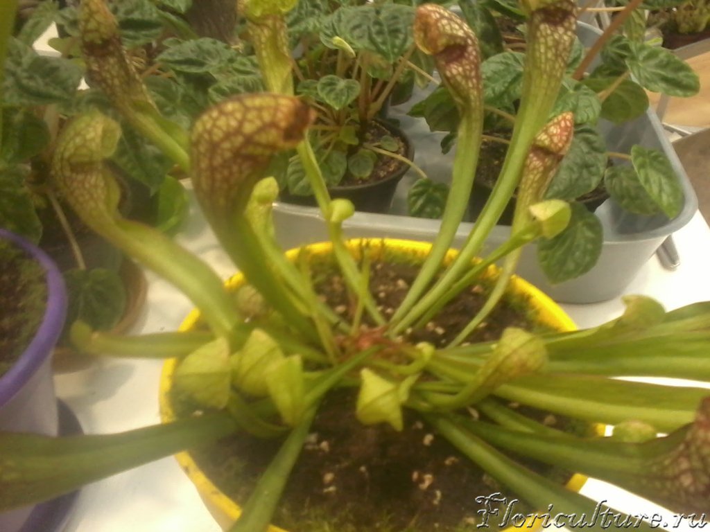 ``Если вам всё-таки кажется, что растение «голодает» - подкормите его половинным раствором рыбной эмульсии (поливать следует почву в контейнере!). Основное питание мухоловка получает из торфяной смеси, в которой живёт.``