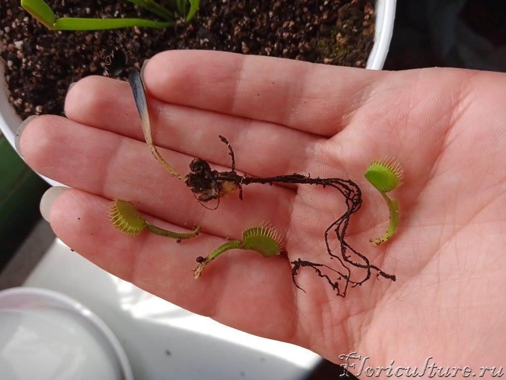 Попыталась оторвать самый старый лист. Оторвала, с куском луковицы с бывшей точкой роста, да еще и выдернула частично мухоловку из горшка. Больше свои кривые руки к ней не суну :(
