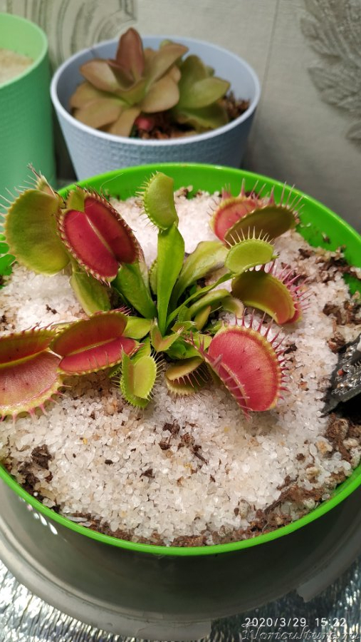 Безусловно естественное освещение лучшее, но окрашивание яркое ловушек происходит либо к концу жизни либо ближе к осени, ну естественно и от сортовой особенности данного вида, что не скажешь про только искусственное освещение, мне кажется в данном направлении выигрывает и конечно же при значительном минусе ( скорости и объема роста). Разница в 14 дней но эффект на лицо, что вызвало такое покраснение при не изменных условиях - в моём случае только свет, на естественном освещении никаких изменений.