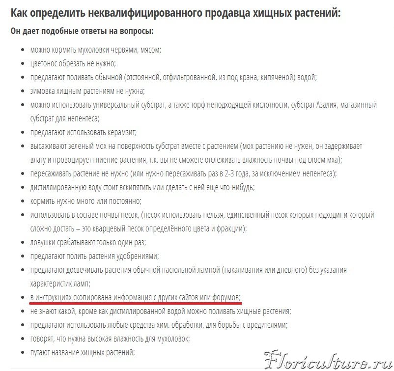 Искала семена дарлингтонии, ну и попутно читала из интереса, что на разных сайтах об уходе за хищниками пишут. Ну кормление твогором и мясом - это уже классика. Ещё просто не пойму логики авторов таких текстов, которые рекомендуют обязательно насыпать керамзит на дно, но использовать нижний полив. Как сделать саррацении или дарлингтонии "болотце" через толстый слой дренажа, если "вода в поддоне может достигать аж 1 см"? Ещё советуют грунт для азалий, отстоянную или кипячёную воду, неглубокие горшки для посадки и притенение от прямых солнечных лучей. Зимовка дарлингтониям нужна только "старым" (это с какого возраста?), смертельные низкие температуры без конкретных цифр, непентесы освещать нужно 16 часов. Росянки и мухоловки сажать нужно в закрытые флорариумы. Всех перлов уже не помню, но это везде. Даже там, где продают хищников или их семена