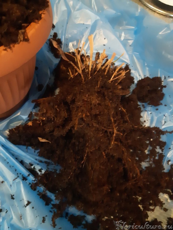 До этого я успел пересадить и разделить куст - одна из точек роста была прямо у края горшка, еще одну часть корней без ростков но со свежими корешками посадил в отдельный горшок в качестве эксперимента