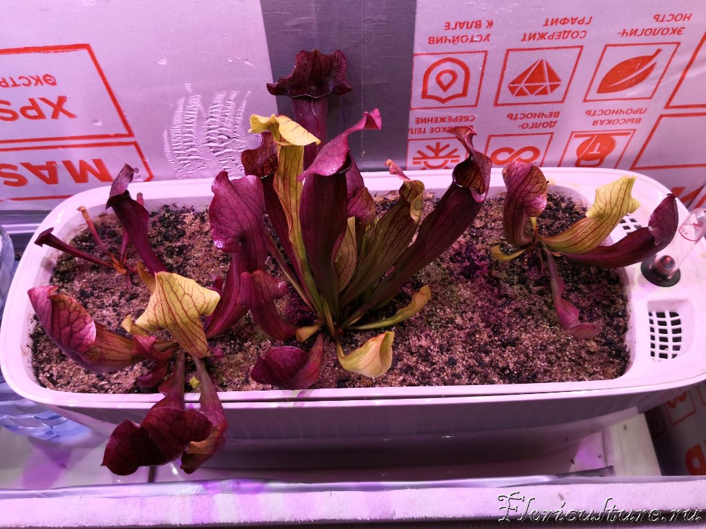 Вот так растут и краснеют на солнце кувшины у неизвестного гибрида белолистной саррацении (что-то подобное продаётся под названием "leucophylla red"). Западный балкон, никакой досветки.