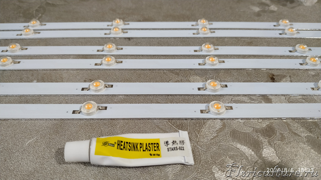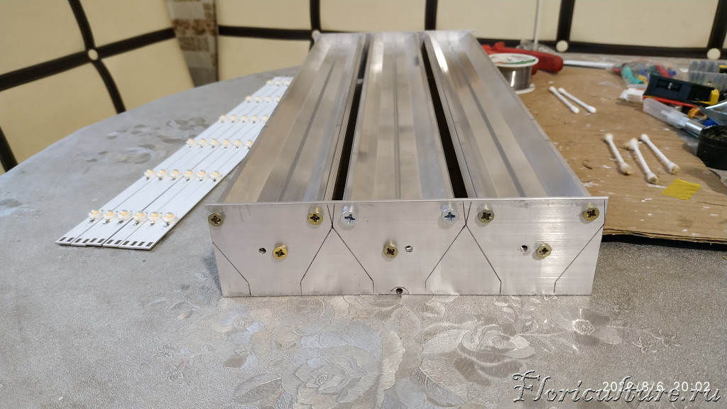 И так, пропаял светики, отмыл флюс, приготовил профиль и в клеил алюминиевые подложки, теперь даю клею капитально высохнуть и на сегодня всё.