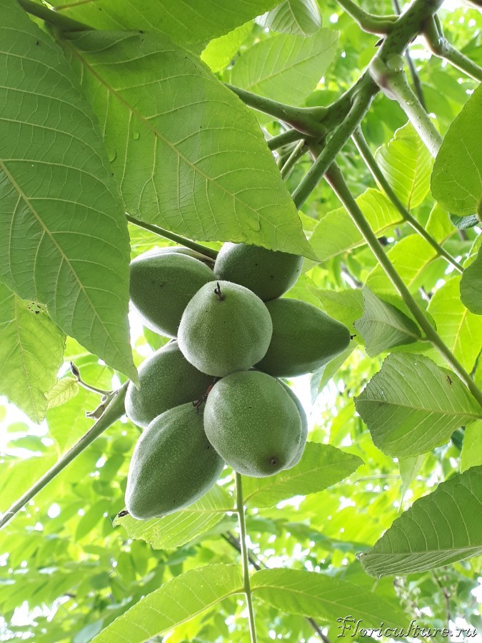 мало, плодоносит одно дерево, на втором пока орехов не видела. Моим лет 15. Сейчас растут быстро, а вот в первые года болели, обмерзали. Они плохо переносят пересадку, поэтому сажать надо сразу на постоянное место. Всячески полезные лекарственные свойства у этого ореха. Отваром листьев моют голову от перхоти, а ноги от грибка. (это я вычитала, но не применяла