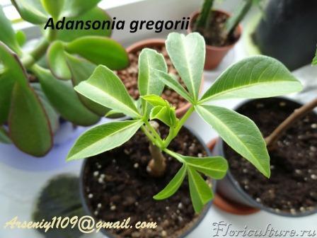 У меня, ровно год назад, проросло из купленных семян очень интересное растение это Баобаб австралийский или Адансония грегории. Это растение из семейства адансониевых, австралийский эндемик. Листья у него, в отличии от адансонии пальчатой, с рождения разделены на сегменты.