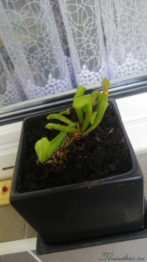 Здравствуйте. Подскажите что делать, цветами занимается сын 10 лет. Расскажу последовательность. Купили дарлингтонию 30 июня. Жила в том же горшке, стояла на веранде за тюль-сеткой, т.е. свет яркий, но прямых солнечных лучей не было. Температура на тот момент на улице была 27°-35°, ночью ~23°, поливал водой с родника. Потом прочитал, что можно поставить в контейнер с водой 1-2см., что и сделал. Так она простояла 3 дня. Потом была перевозка цветка в квартиру, везли без контейнера с водой 1.5ч. В квартире ~25°. На утро половина дарлингтонии была сухой, обрезали, грунт влажный при этом. Пересадила в керамический горшок такого же размера, корни вроде не гнилые, поставили на балкон в контейнер с дистиллированной водой, там нет прямого солнца-восток, ~20°-23°. Из живого осталась 1 голова, и то что то я сомневаюсь, что она оживет. Фото как она угасала. Что мы сделали не так?