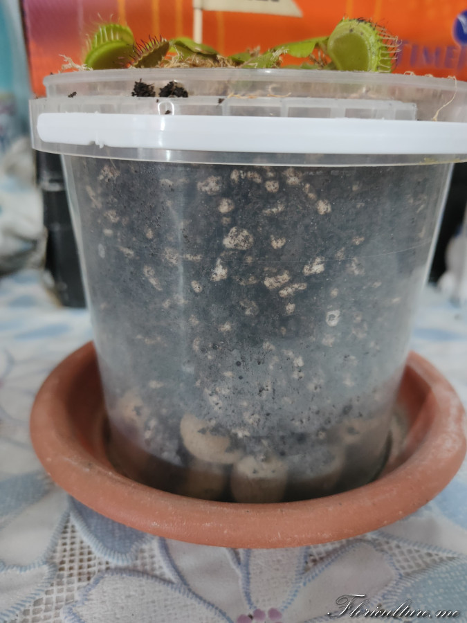 Добрый вечер. Месяц назад завел себе Венерину Мухоловку в интернет-магазине, приехала в отличном состоянии, в малом горшке. Как и было написано в инструкции, дал ей неделю просто постоять, вообще не трогал, после чего пересадил в другой, бо́льший по размеру горшок. Все сделал, как указано в инструкции - смешал 2:1 кислый торф 4.5-5.5ph и вымоченный агроперлит, на дно горшка насыпал керамзит (в дне горшка есть отверстия). Растение пересадил быстро, минут за 5-10, сверху выложил мхом сфагнумом, поставил на стол и каждый день с 8 до 20 часов включаю фитолампу 40вт. Отрезал отросток цветоноса. Для полива купил дистиллированную воду, поливал шприцом по мере подсыхания верхнего слоя почвы. Несмотря на все это, со второй недели и по текущий момент моей мухоловке все хуже и хуже и хуже, два новых зародыша ловушек почернели, потихоньку отмирают взрослые ловушки, растение вянет. Пробовал поливать, погружая на час 2/3 горшка в таз с водой, тоже не помогает. Подскажите, пожалуйста, как я могу помочь своей мухоловке. Фото прилагаю (через неделю после доставки (10.09), сразу после пересадки (14.09), горшок в разрезе (14.09), еще через 2 недели (28.09) и сейчас (05.10)
