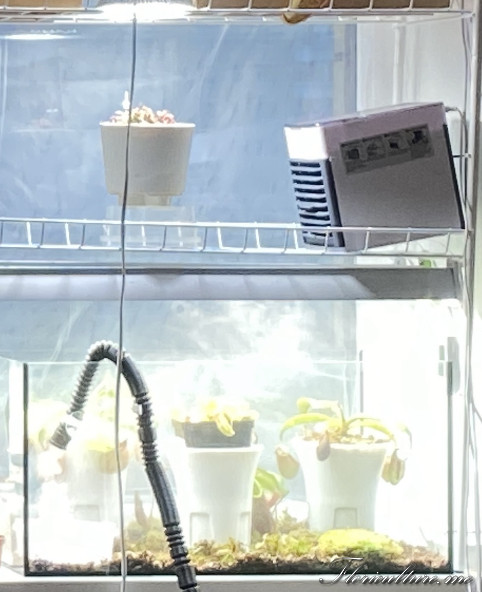 Про аквариумы: они у меня сухие. Прикладываю фото: на дне грунт для того, чтобы забирать лишнюю влагу после полива, если перестараюсь (поливаю вне аквариума на решетке и даю стечь). В аквариум опущен шланг от террариумного увлажнителя, мощность подачи пара стоит на минималке, сверху настольный вентилятор. Сейчас по бокам еще греющие коврики для поддержания температуры.