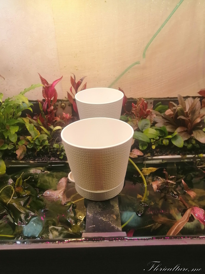 Милена понял, вот которые под красным светом, у них поддоны сняты и они не доходят до дна контейнера. На дне вода, но она не касается горшка и поэтому испаряется через субстрат. Т.е. он не в воде, а влажный. Расстояние от воды до горшка 5 мм.