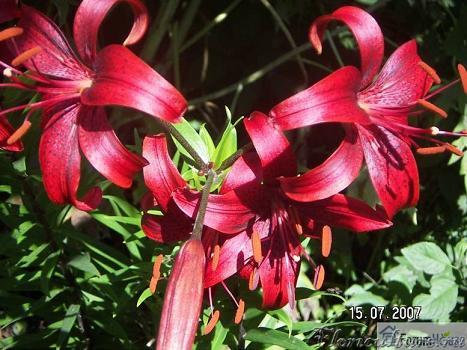 Азиатские гибриды. Красный, у основания лепестков золотистый, махровый, 12 лепестков, без крапа. Нет пыльников. Диаметр 15-16см. Соцветие из 6-7 цветков. Высота 60-90см. Морозостойкий. Устойчив к болезням