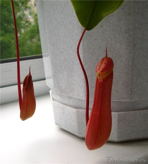 Вчера я случайно забрела в цветочный магазин и впервые увидела непентес (дома у меня только венерина мухоловка и росянка). Он мне так понравился, что я, не долго думая, решила его купить. Но продавщица оказалась немного "не от мира сего". Она затруднилась ответить, какой именно это вид непентеса (ссылаясь на то, что она работает в магазине недавно), но при этом настойчиво убеждала меня в том, что воду из кувшинов МОЖНО ПИТЬ (интересно, зачем? И как? Через соломинку?!)