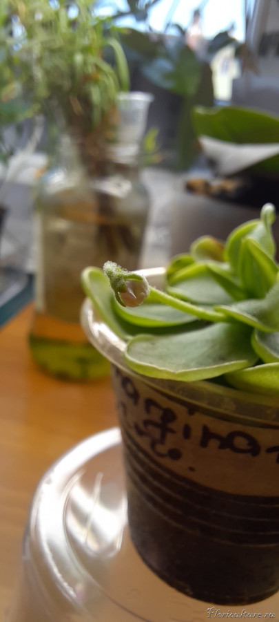 Сначала испытал на двух Drosera capensis (т.к. росянок много, а жирянка пока одна) - через сутки после помещения на листья обезжиренного молока, разбавленного двукратным количеством воды, наблюдалась вполне здоровая реакция со скручиванием листьев вокруг "жертвы". Когда настал черёд жирянки, то досталось аж восьми листьям, а капли вместо иглы шприца отмерял пипеткой. Печальный результат проявился уже на следующий день: кончики всех листьев, где было молоко, стали вялыми и собрались отмирать. Скорее всего, петролейный эфир из молока улетучился не полностью, а жирянке хватило даже его следов. До этого момента сомневался, стоит ли пересаживать цветущую жирянку - прошлая пересадка была год назад, грунт преимущественно торфяной, и на поверхности уже давно обосновались скользкие водоросли, но она ещё вроде не жаловалась. Теперь пересадил в более минеральный грунт, попутно отщипнув 4 самых деформированных листа на укоренение. После недели под колпаком пришлось обрезать кончики ещё у двух листьев: на высохшем молоке начала расти плесень.