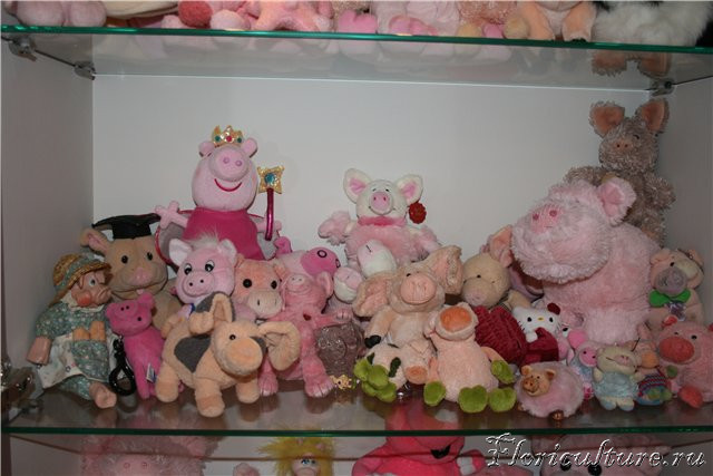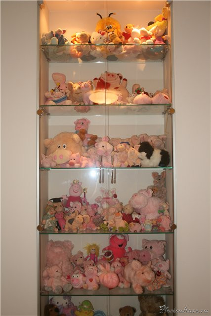 Для свинюшек специально создавался застекленный шкаф с подсветкой. Теперь у них есть домик, они не пылятся, прекрасно смотрятся и радуют глаз.