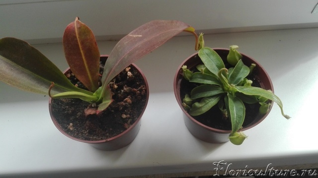 Недавно начались холода и занес непентесы с балкона на подоконник, заодно купил китайскую светодиодную двухцветную лампочку(было заявлено что для растений). Включал лампу в 7 утра, выключал в 9 вечера. Растения с картинки стояли рядом, точно также как на фото, лампа длинная, свет падал равномерно.