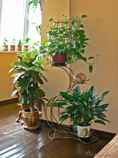 А вот обещанное фото моего сборника:) Так смотрится моя стоечка на 10 вазонов(как оказалось, а не 11). Сверху вниз: сциндапсус, хойя карноза, плющик Golden Jytte, пеперомии (вариегатная и обычная), вариегатная монстера, маранта триколор, кисличка, сциндапсус мраморный, плющ хедера, маранта ктенанте