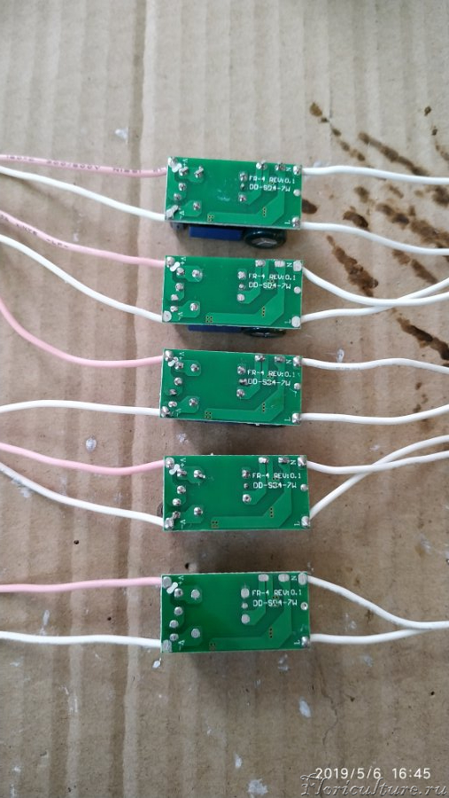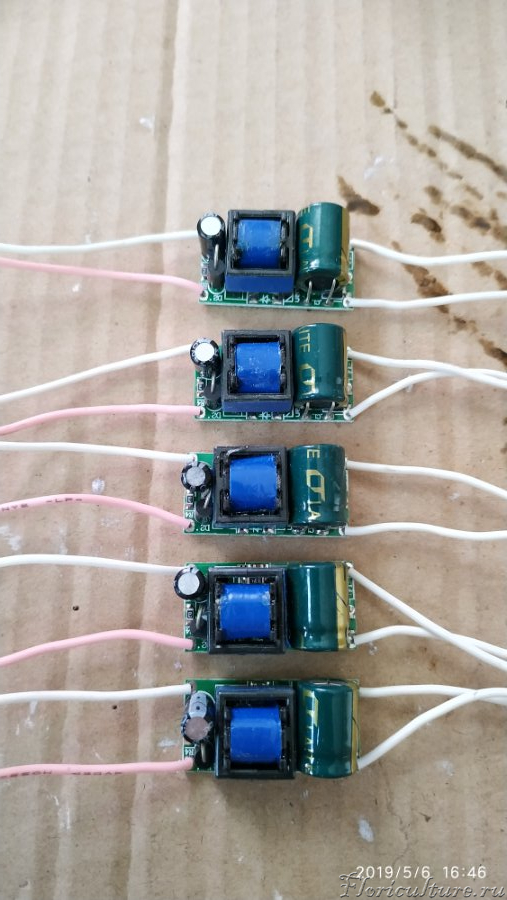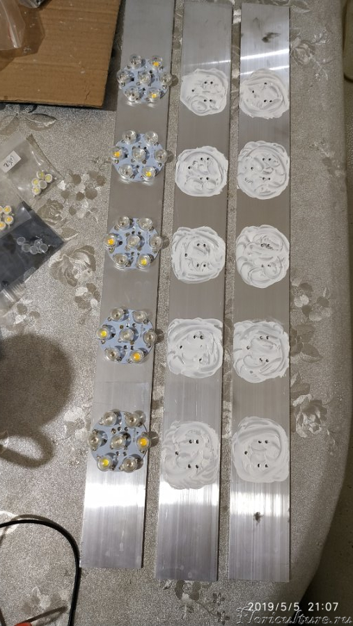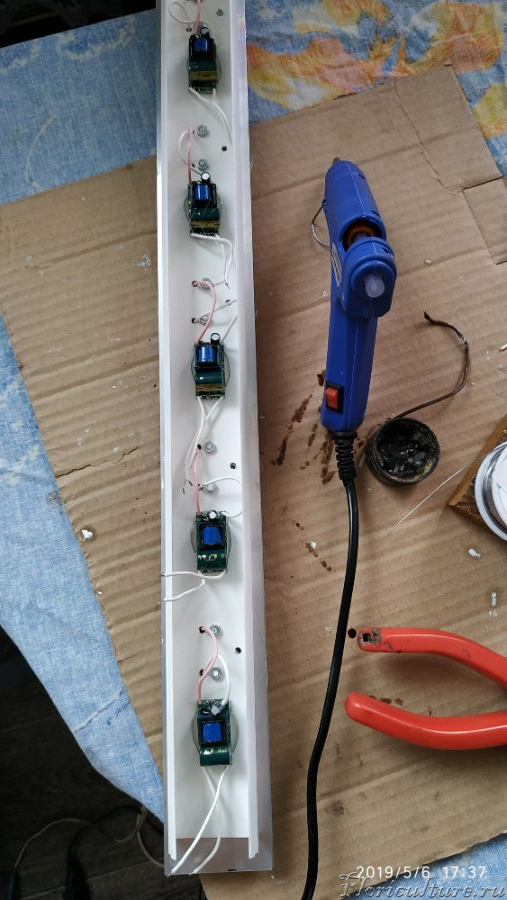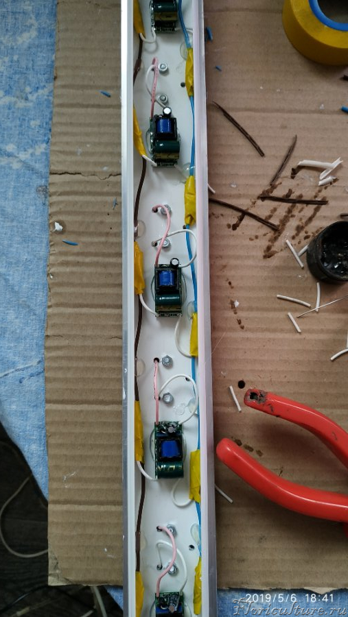Собрал и подключил первый светильник, каждую сборку светиков подключил к своему драйверу, почему отдельно, дело в том, что купленные драйвера не соответствуют заявленным характеристикам по току, пришлось использовать таковы, дабы не жарить кристаллы светиков и продлить срок службы, запитал рабочим током в 280 мА.