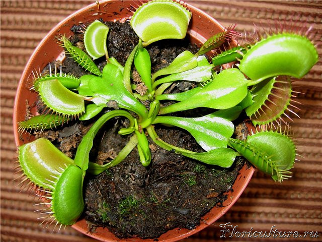 Вскоре начала цвести, подруга недала срезать цветонос(у неё своя философия) никокие доводы и факты непомогли:heap::D . Сечас собралась опять цвести(с первого цветка собрал штук 40 семян) А так всё нормально , ловушки растут быстро, до обеда солнце 5ч. досвечиваю двумя люминисцентными лампоми по 15wt(маркировки никакой) .