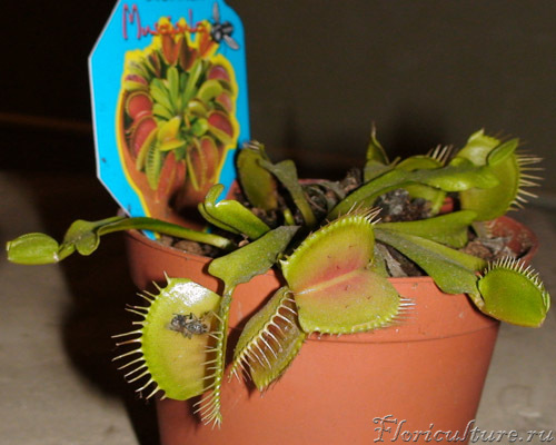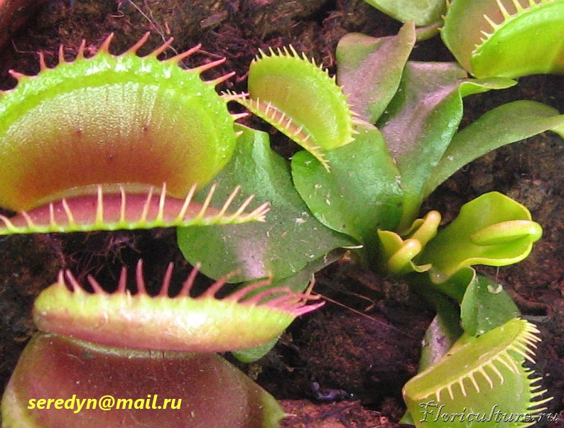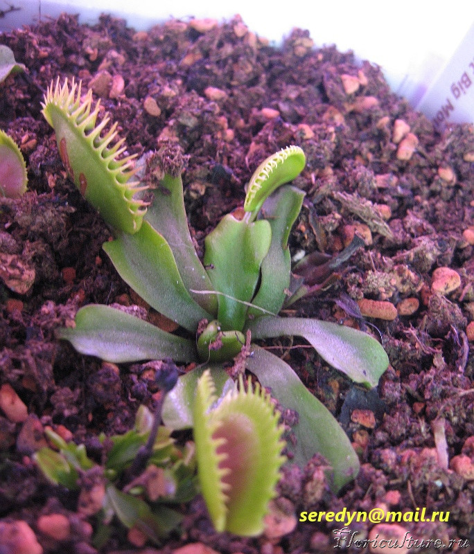Мне тоже в позапрошлом году привезли меристемную мухоловку из Сочи, она была плачевном состоянии, дело было где-то в октябре, растение в скором времени было отправлено зимовать. Прошлой весной я его рассадил и получил 3 мухоловки. 1я умерла уже к лету, 2я пережила зимовку и сейчас выглядит несколько плачевно и жалко, но вроде потихоньку растет. 3я эта растёт, как на дрожжах, ловушки одна больше другой и появляются со скоростью примерно 1-2 ловушки неделю. Вот только никак краснеть не хочет, хоть и стоит под МГ.