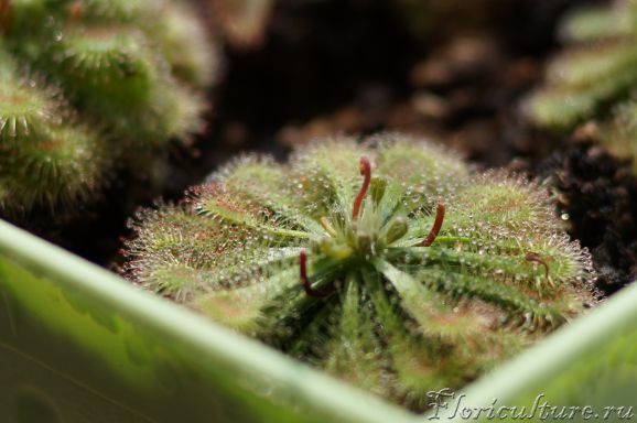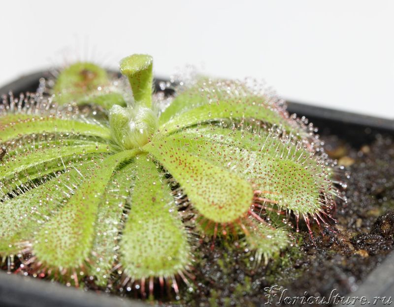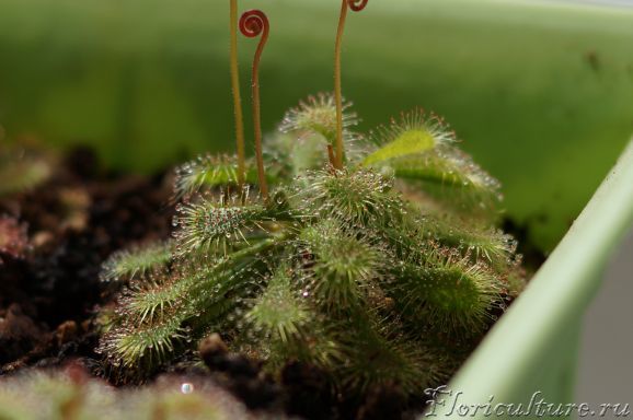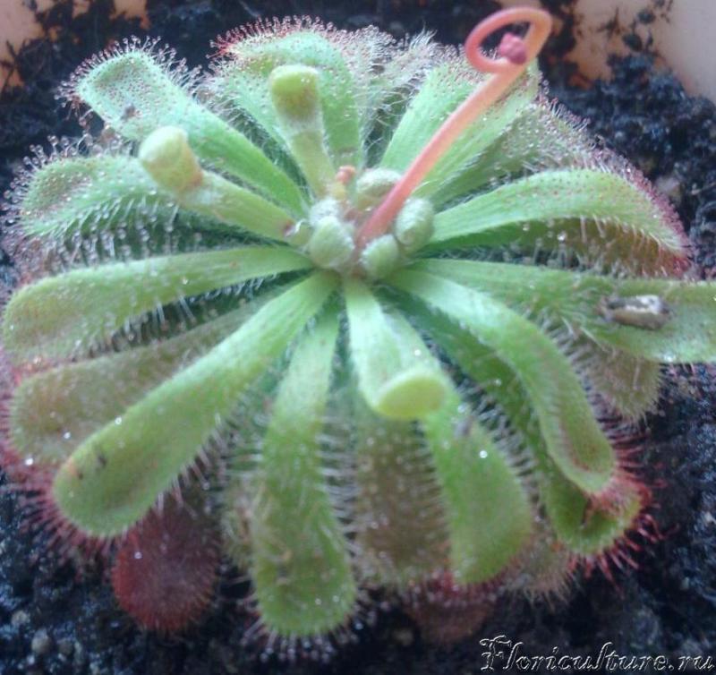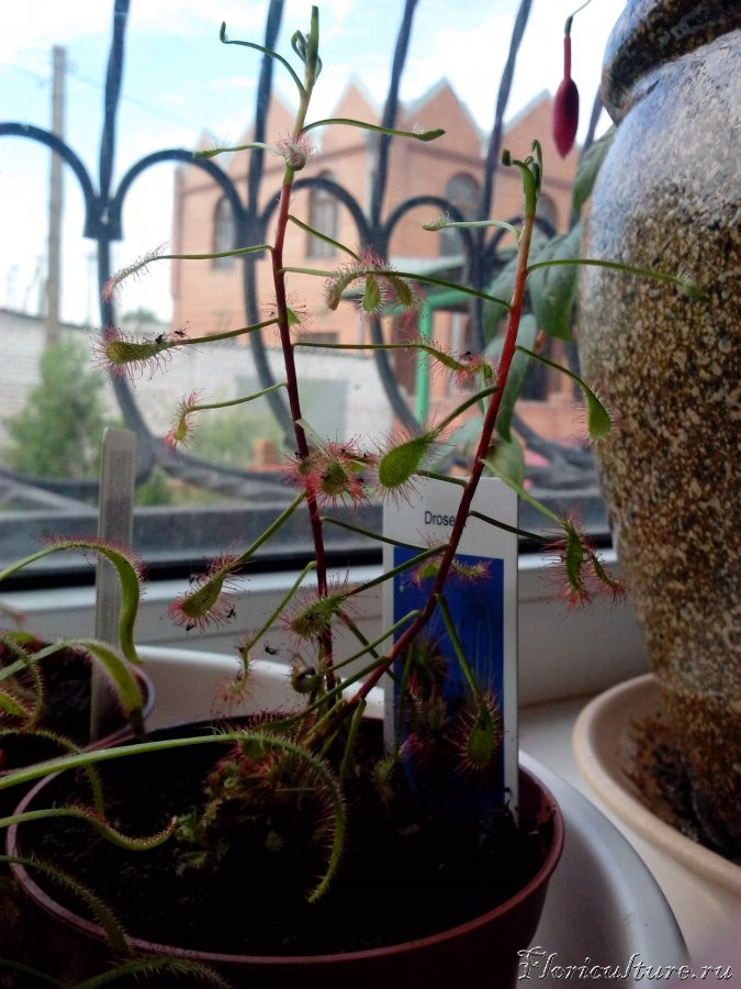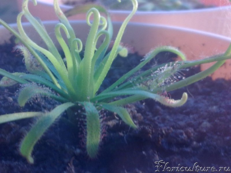Здравствуйте! Я хотела бы проконсультироваться на счет drosera madagascariensis. Растение красивое, но очень хрупкое. Чем больше оно растет - тем больше начинает клониться набок (особенно, когда вылезли цветоносы). Что делают в таких случаях с ней? Обязательно ли цветоносы обрезать на росянках (выдержит ли растение цветение, если не обрезать)? Росянки живут у меня чуть больше месяца, зацвели 2 капских и 2 мадагаскарских. Вот фотография (сразу после покупки):