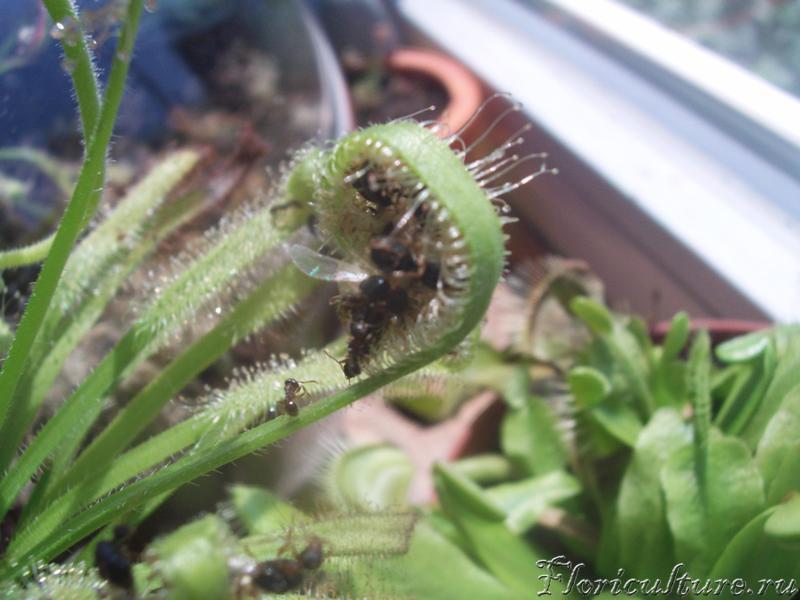 скажу так: муравьи- плохая добыча для росянок и вовсе не прилипляются. Может от того, что очень сильное насекомое, несмотря на свой крошечный размер. Поставила непентесы рядом с муравейником, а заодно лоток с росянками. Через некоторое время кувшины были полны насекомыми. Идёт муравей по кувшину на нектар, пробует его, потом полная дезоориентация, он становится буквально "пьяным" и просто падает в кувшин, откуда выбраться не может. В это время некоторая часть падает на росянки. И ни один муравей не приклеился. Заинтересовало, ставила разные - результат один. Даже большие капские, которые с лёгкостью ловят огромных мух, муравьёв прилипить не смогли. А они у меня все в росе, на фото можно видеть. Аналогично было с фалконери, бинатой и аделае. Ни один муравейка не приклеился, но десятками заполнили кувшины у непентесов и гелиамфор... ну это я лично наблюдала.