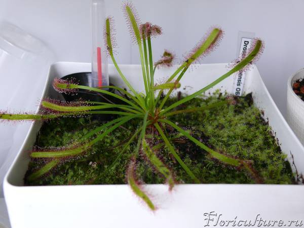 D.capensis специальная зимовка не нужна, но дополнительная подсветка на мало освещенном подоконнике обязательна! Проще всего использовать люминесцентные лампы типа Flora минимум 10, а лучше 12 часов. От стаканчиков растения нужно постепенно отучать, росянки капские и алиса прекрасно растут без них.