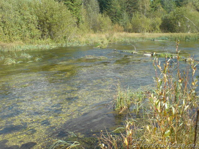 Берег реки больше напоминает заливной луг (коим скорее-всего и является), а не болото. Росянки, вереска, клюквы и подобных болотных растений - нет. Растет несколько видов орхидей, ивы, лютики.