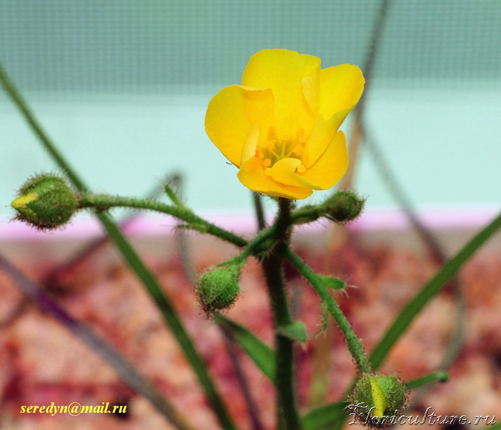 (чуть больший размер фото по клику) Интересно, что у Дрозофиллума абсолютно весь цветонос от основания до всех кончиков, покрыт пищеварительными желёзками. Неудивительно, что в природе у него нет естественных вредителей. Ну кроме человека, конечно... Другая интересная особенность, в отличие, например, от росянок, цветы распускаются не с нижнего первого, а самого последнего верхнего: